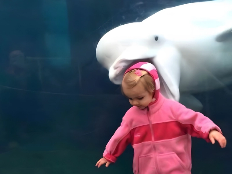 Likely Camera: GoPro Hero 11 Purchase Source: GoPro Price Range: $400–$450* A curious dolphin hovers, mouth parted, near a child safely behind glass. The playful eye line suggests fascination more than hunger, a charming interspecies meet cute.