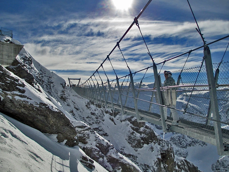 At about 10,000 feet, the Titlis Cliff Walk is Europe's highest suspension bridge. Only three feet across, it grips an icy slope. Wind gusts, faint creaks, and sheer drops combine for a stark alpine trial of nerve.