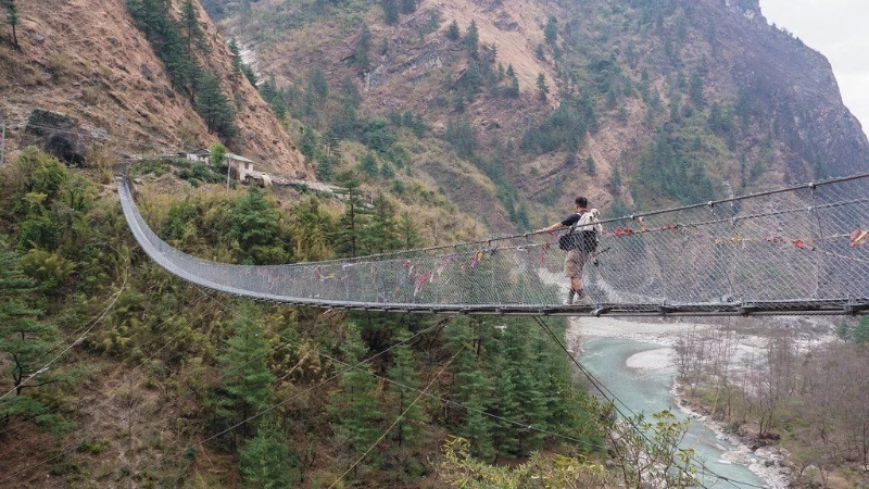 Narrow and swaying above a steep Nepalese gorge, the Ghasa Suspension Bridge serves people and livestock alike. The clatter of hooves on planks is both routine and tense, showing its daily importance.