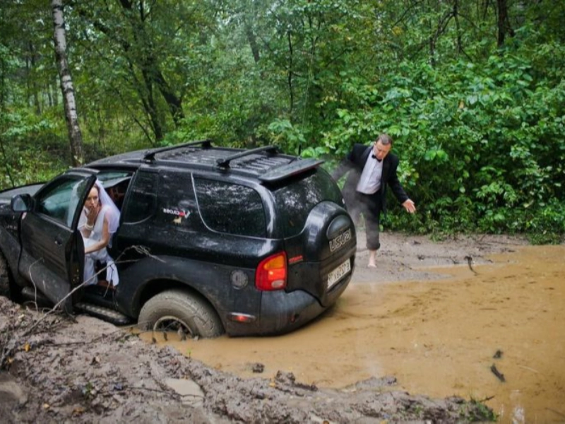 Mechanical trouble intrudes, transforming elegance into roadside teamwork. Formalwear juxtaposed with practical problem solving creates irresistible contrast. Adversity forges a story they will retell with increasing dramatic flourish. Real life refuses to pause for romance.