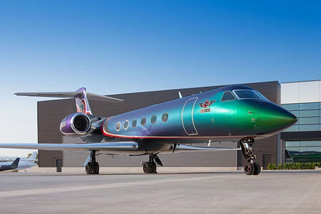 Clay Lacy Aviation’s Gulfstream GV, nicknamed “SexyJet,” wears chameleon paint that shifts with the light. Lux interiors, gourmet galley, and twin Rolls-Royce engines make this color-changing craft the definition of airborne indulgence.