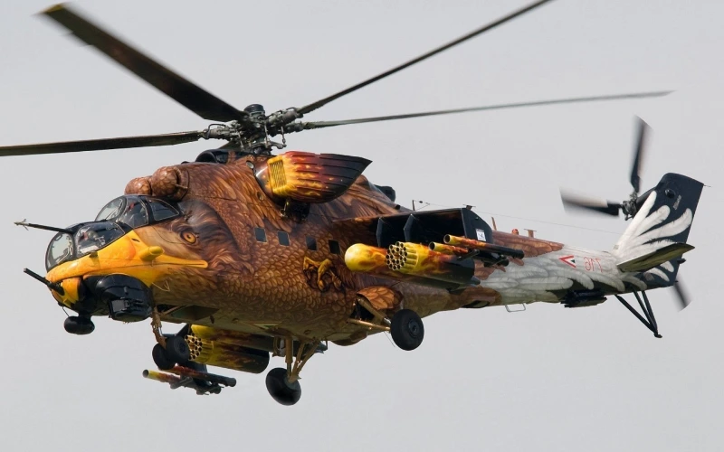 An eagle spreads across this Hungarian Mi-24V, feathers flowing from tail to rotor. The lifelike paint merges artistry with intimidation, turning the helicopter into a predator of the skies.