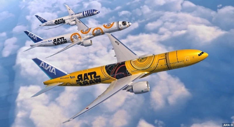 ANA’s Star Wars jet transforms its fuselage into a galactic billboard, complete with iconic characters. The partnership with Lucasfilm makes every flight an interstellar adventure for fans and flyers alike.