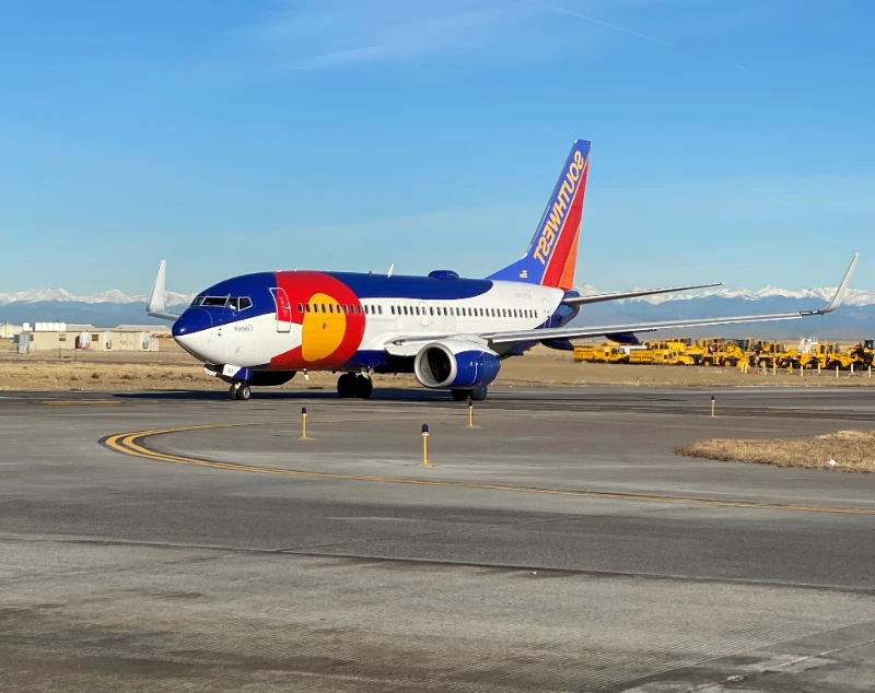 Southwest wraps this aircraft in Colorado’s flag—bold red “C,” golden sun, and blue-white stripes—celebrating its Denver roots while giving spotters an unmistakable sight in any lineup.