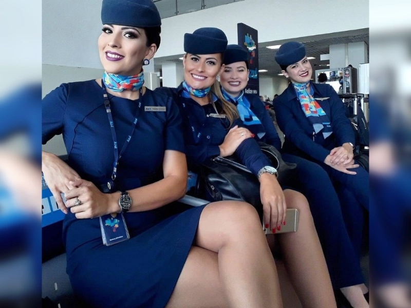 Poised flight attendants await their next departure. Gathered near a gate or lounge, they wear coordinated uniforms with refined accents like scarves or hats. Relaxed interaction reveals camaraderie: shared smiles, brief conversation, attentive listening. Airport elements - screens, passengers, aircraft through windows - establish context. The portrait emphasizes service, teamwork, and approachability, reminding viewers that behind polished presentation are skilled professionals ensuring safety and comfort aloft.