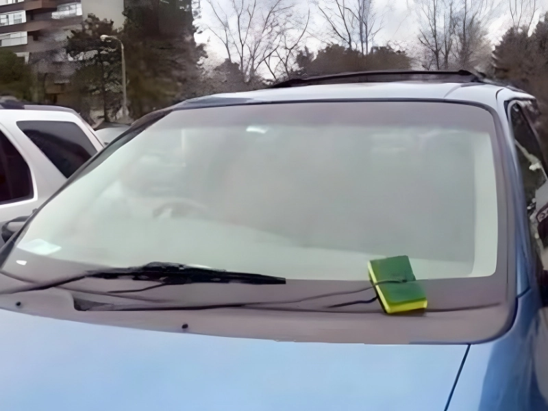 This makeshift repair might allow for temporary driving, but it compromises visibility and safety during inclement weather.