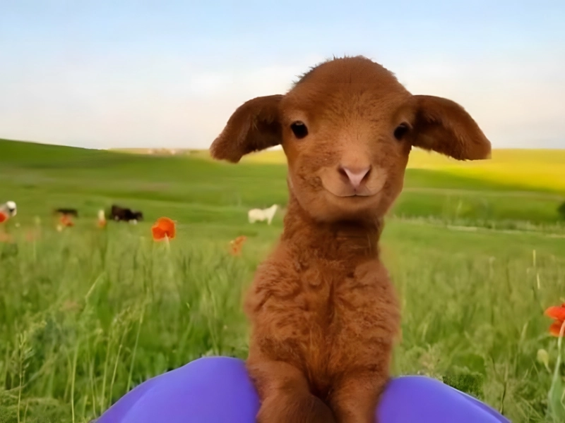 Here a sweet brown kid nestles on the photographer’s legs among vivid blossoms and fresh grass while cows graze in the distance, radiating calm charm.