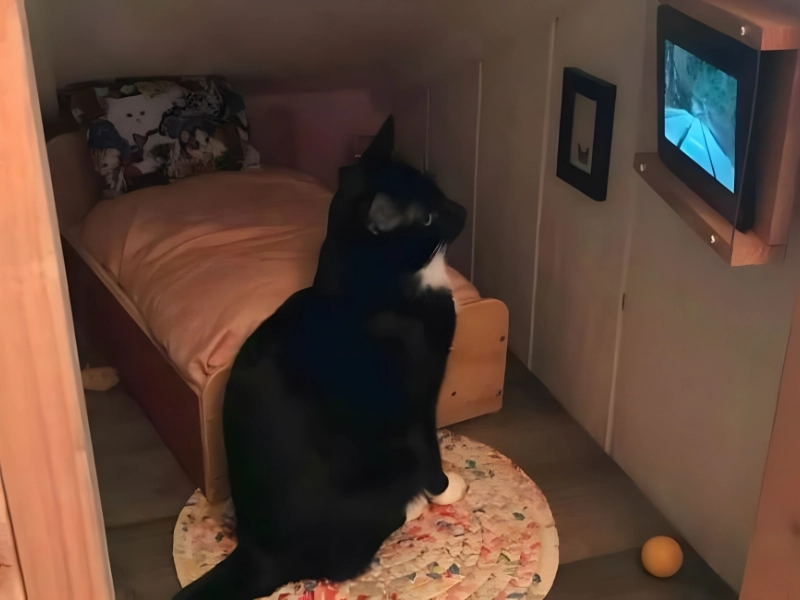 This pampered cat enjoys a custom nook beneath the stairs—think Harry Potter’s space, redesigned with luxury. A round rug, toy ball, tiny frame, and plush bed with a matching cushion set the mood. Best feature? Its own television.