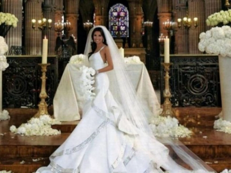 Eva Longoria chose an Angel Sanchez design in rich organza and silk. Its fluid lines and meticulous structure delivered poised elegance and inspired brides seeking grace with modern edge.