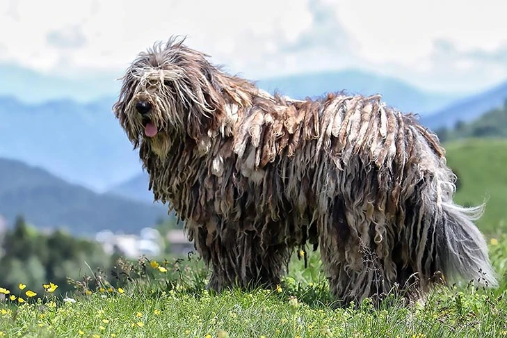 The Bergamasco Sheepdog wears a dramatic coat of felted mats formed by three hair types, offering insulation in Alpine winters. Intelligent and even-tempered, it bonds closely with family and needs only occasional maintenance once the mats mature.