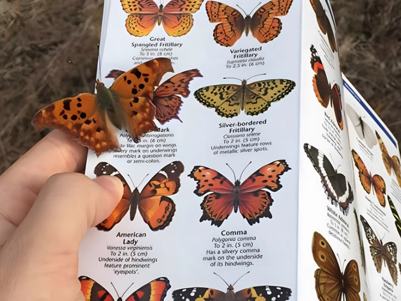 What happened: Butterfly lands on its own photo Where: United States. A striking Question Mark butterfly touched down on a book page describing its species, as if it recognized itself.