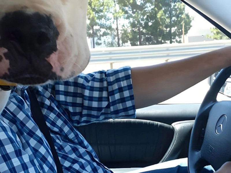 Either this dog is learning to drive or acting chauffeur. What other skills hide beneath that calm stare? The outfit even matches the eyes. That is the face we all make stuck in traffic.