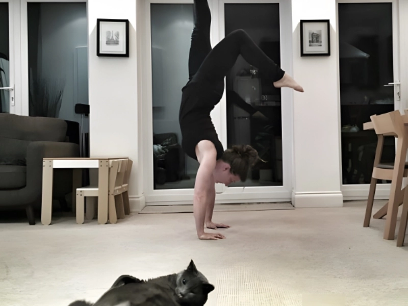 This cat strikes a downward facing pose. While the owner practices yoga, the cat displays its own variation. Maybe the human embarrasses the cat, who pretends never to stretch. Attempting still counts. Even a lounge cat can progress.