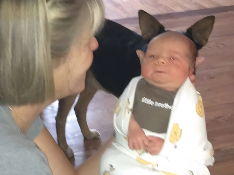 Looks like a rare Grogu snapshot. Since seeing him on The Mandalorian we crave more. Not actually Baby Yoda, just a perfect canine ear alignment framing the baby. The child seems to think I am all ears Mom.