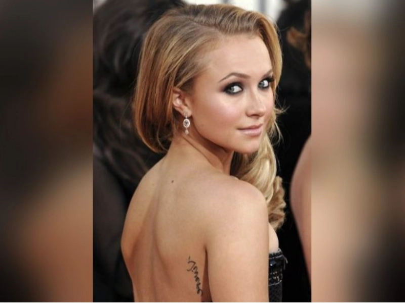 Hayden Panettiere’s back reads “Vivere senza rimpianti” (“live without regrets”). Though misspelled, it still urges her to embrace life fully.