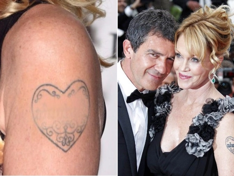 Stunning Celebrity Ink: Must-See Tattoo Photos Advertisement 26. Melanie Griffith Advertisement Melanie Griffith once displayed Antonio Banderas’s name inside a heart; its later removal marked her step into a new chapter. Next PageAdvertisement You May Like 8 Animal Pregnancies: Surprising Before and After Transformations Ranking the Most Dangerous Dog Breeds Lost in Translation: The Most Amusing Fast Food Order Mix-Ups The Most Luxurious Gems and Jewelry Owned by the British Royals 10 Everyday Items You Should Never Pour Down the Drain 7 Mind-Blowing Upside-Down Homes to See Across the Globe Trending Lost in Translation: The Most Amusing Fast Food Order Mix-Ups 22 of the World's Most Perilous Bridges to Think Twice Before Crossing 7 Mind-Blowing Upside-Down Homes to See Across the Globe 9 Heartwarming Animal Photos You Will Instantly Want to Hug
