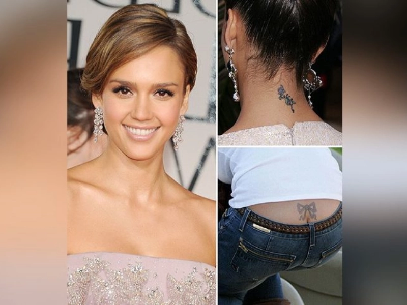 Jessica Alba balances grace and meaning. A bow on her lower back adds elegance, while subtle wrist and neck designs celebrate love, strength, and individuality.